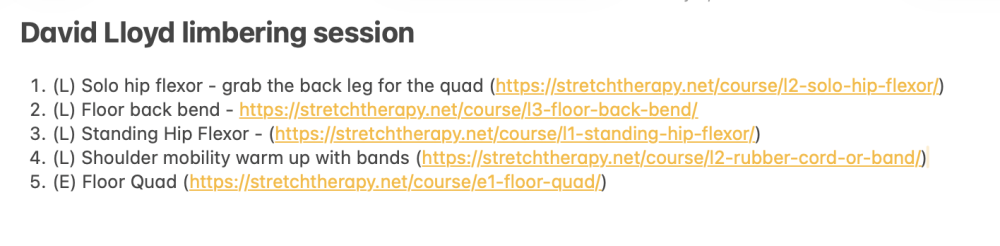 Day 608 of stretching and flexibility journey Yesterday Follow up session with osteopath for checkup on my torn bicep femoris tendon that has yet to fully recover (after 3 months) - although I am back to fairly vigorous training, some positions — where the hamstring is fully loaded — are still quite painful. During the ultra scan, while the original problematic area has fully healed, it turns out that I'm missing some collagen at the bottom of the bicep femoris, right around tibialis, which makes sense since this is the area that lights up when I am flexed at the hips and I try to draw my (right) knee towards my chest. Going to do some research and/or start working with a rehab physical therapist who specializes in hamstring rehab On lying relaxation practice For multiple factors, I think, I've been able to consistently practice LRP for 4 days in a row (probably the longest consecutive days) Counting the breathes (thanks @oliviaa for sharing the article) so far seems to be pretty effective at reducing the aversion I had the thought that some of the previous resistance to the LRP was the time (despite short amount) spent setting up the audio recorded session etc whereas right now, I just flop on the ground and start counting breathes Perhaps throughout this process, I may return to recorded sessions however, the breathe counting is currently working and "if it ain't broke, don't fix it." and at the same time, curious if I streamline playing the recorded sessions if that reduces resistance to using audio clips During my LRP practice, I'm finding the elapsed time between each breathe hold steadily increases and at around 20 something breathe count, it feels (not sure, since I'm not keeping track) as if there's like 20 seconds between each breathe Finding myself (outside of LRP) counting breathes throughout the day